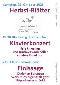Anlässlich des Abschlusses der Bilderausstellung von Christian Salvesen treten am 25.10. 2025 um 19:30 Uhr im großzügigen Chorraum der Evang. Stadtkirche in Blaubeuren der Konzertpianist Erik Salvesen und seine Studentin Anna-Zawadi Zeller mit Werken von Maurice Ravel u.a. auf.
